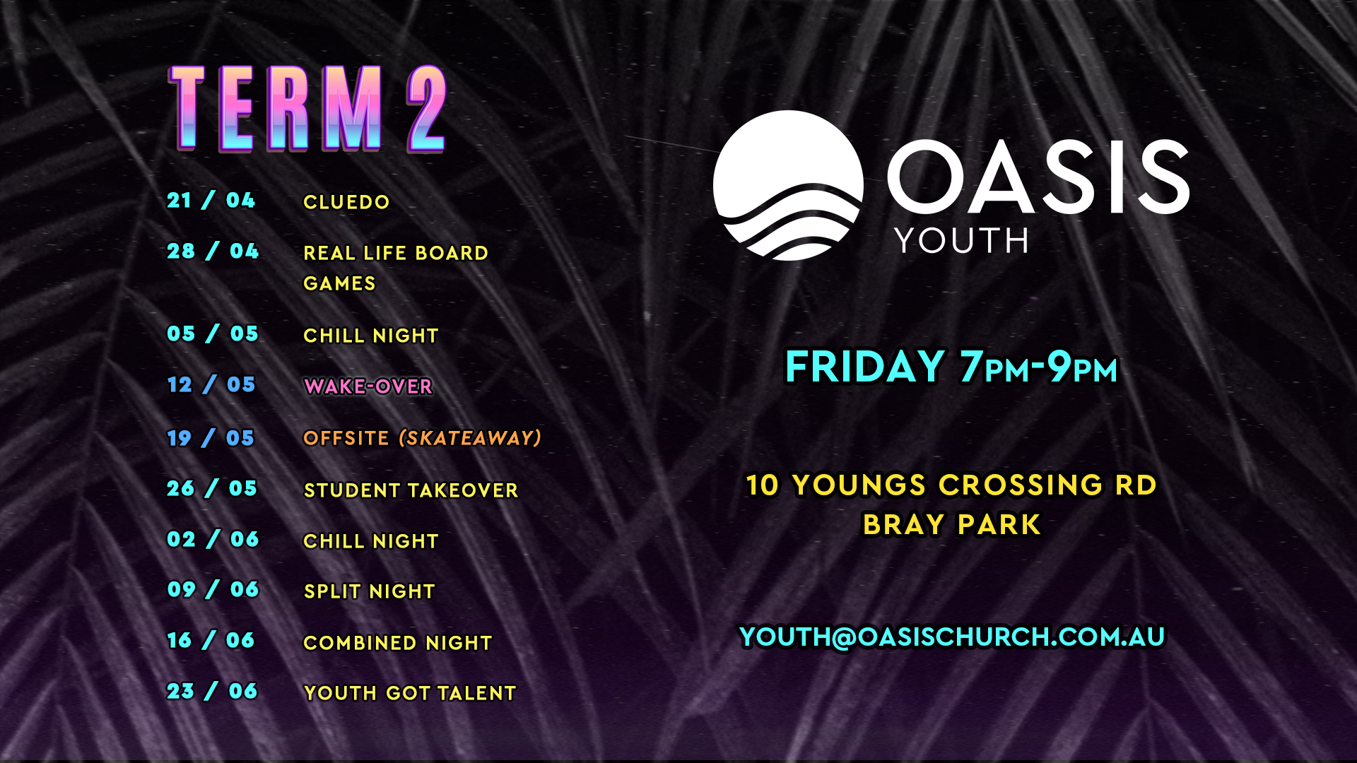Oasis Youth meets weekly on Friday nights during the school term. Our program runs from 7pm-9pm and is for anyone in high school (Years 7-12). We seek to create a safe, fun, and welcoming space where youth can come to play games, chill out, form friendships and community, and hear about Jesus.