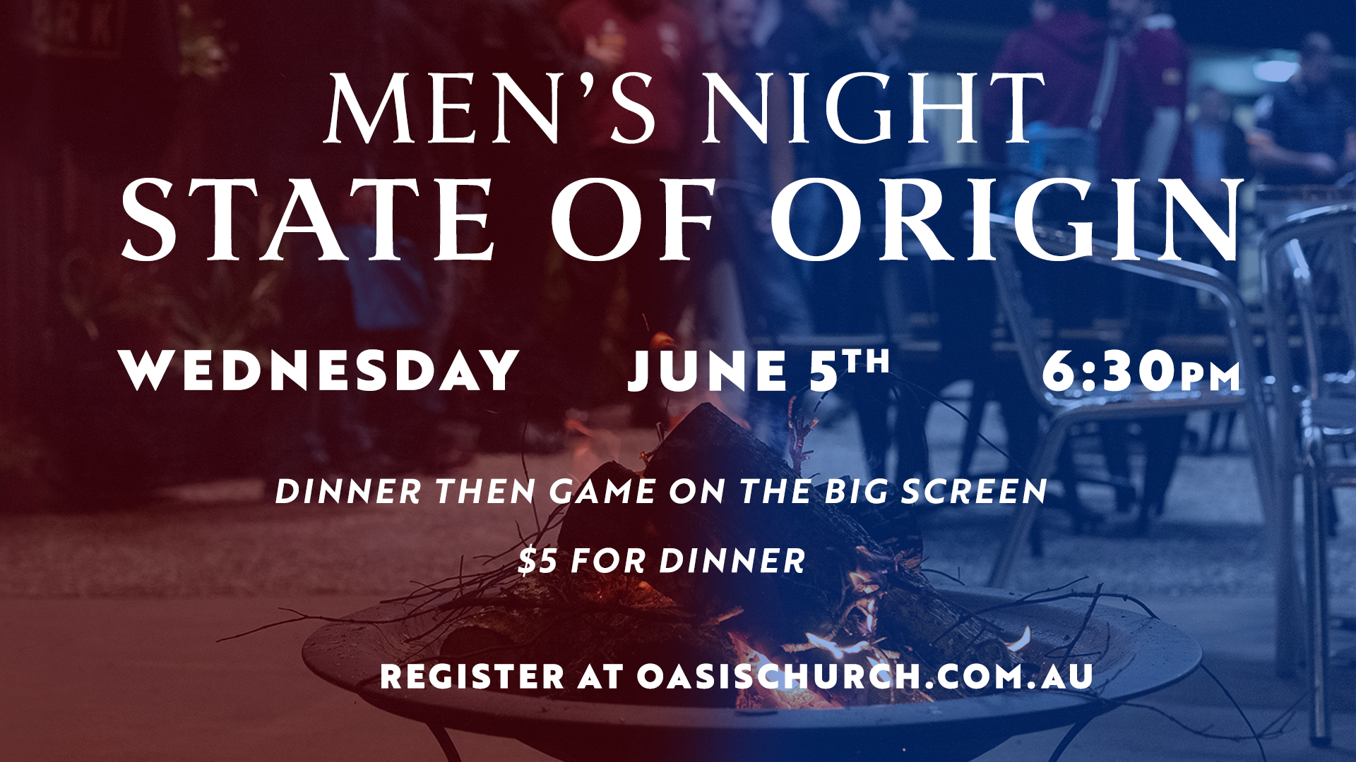 Oasis Church 10 Youngs Crossing Rd, Bray Park, QLD, AustraliaWill the Maroons keep the trophy this year? Let's find out together in front of the BIG SCREEN! We'll have dinner