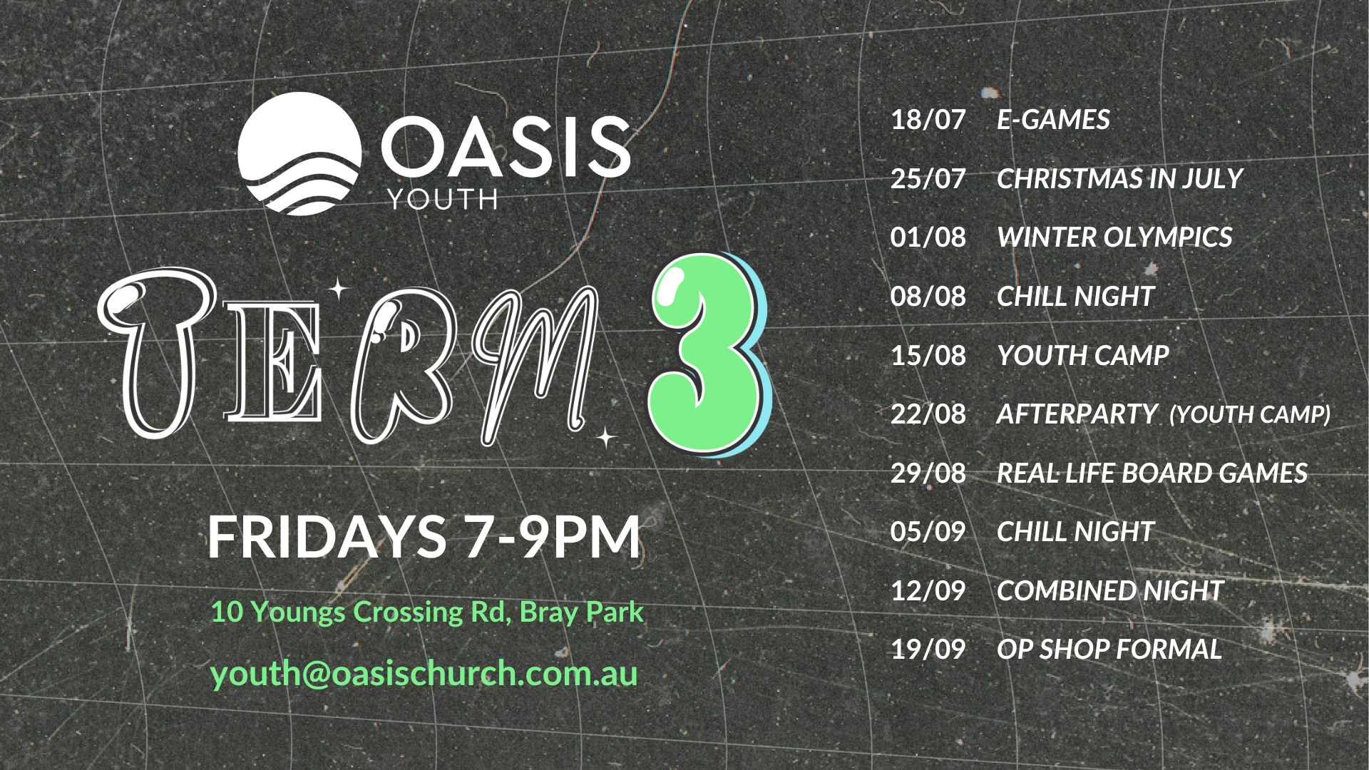 Oasis Church 10 Youngs Crossing Rd, Bray Park, QLD, AustraliaJoin Us for Oasis Youth! Oasis Youth gathers every Friday night during the school term, offering an exciting program from 7 PM