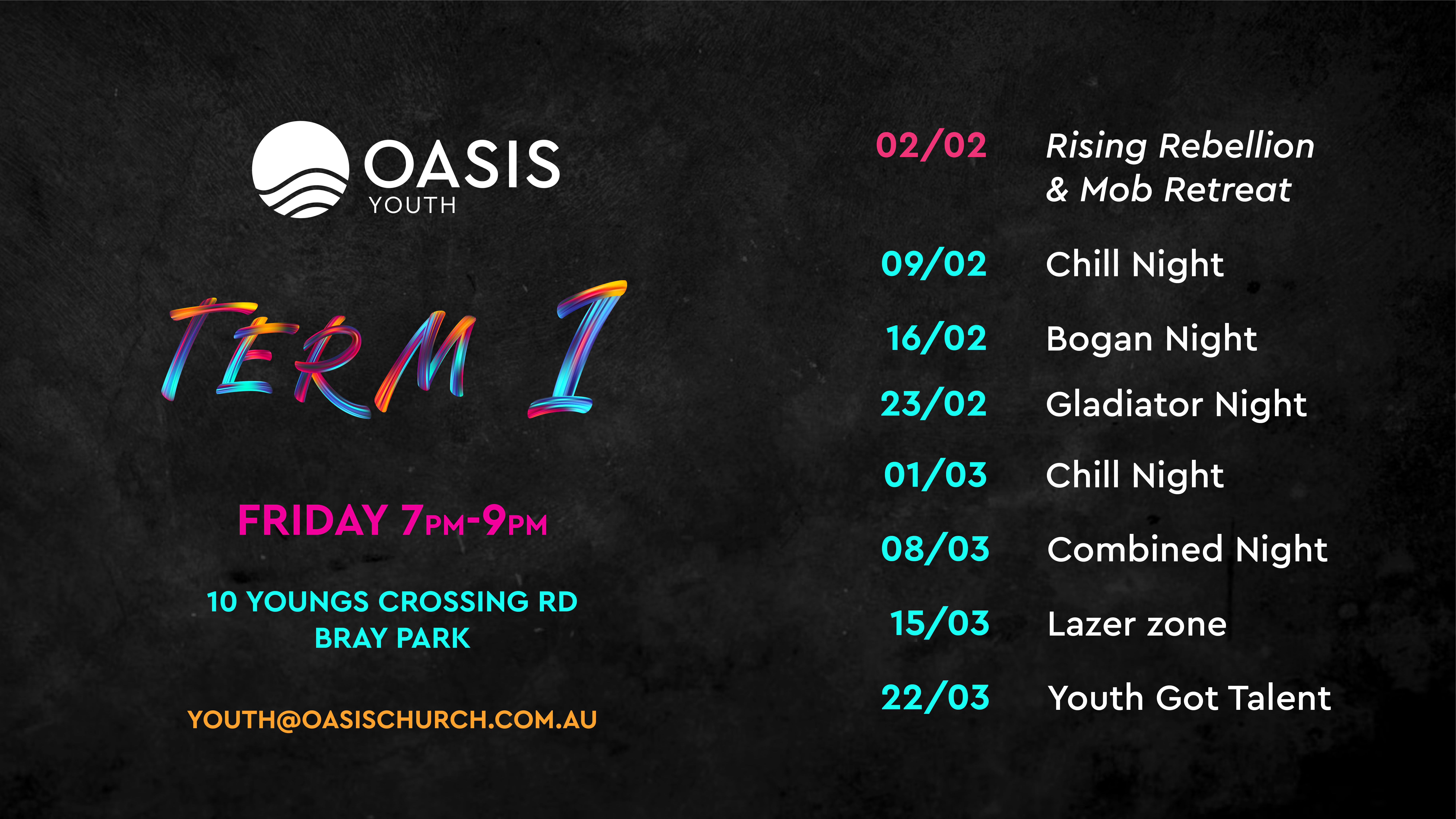 Oasis Church 10 Youngs Crossing Rd, Bray Park, QLD, AustraliaOasis Youth meets weekly on Friday nights during the school term. Our program runs from 7pm-9pm and is for anyone in