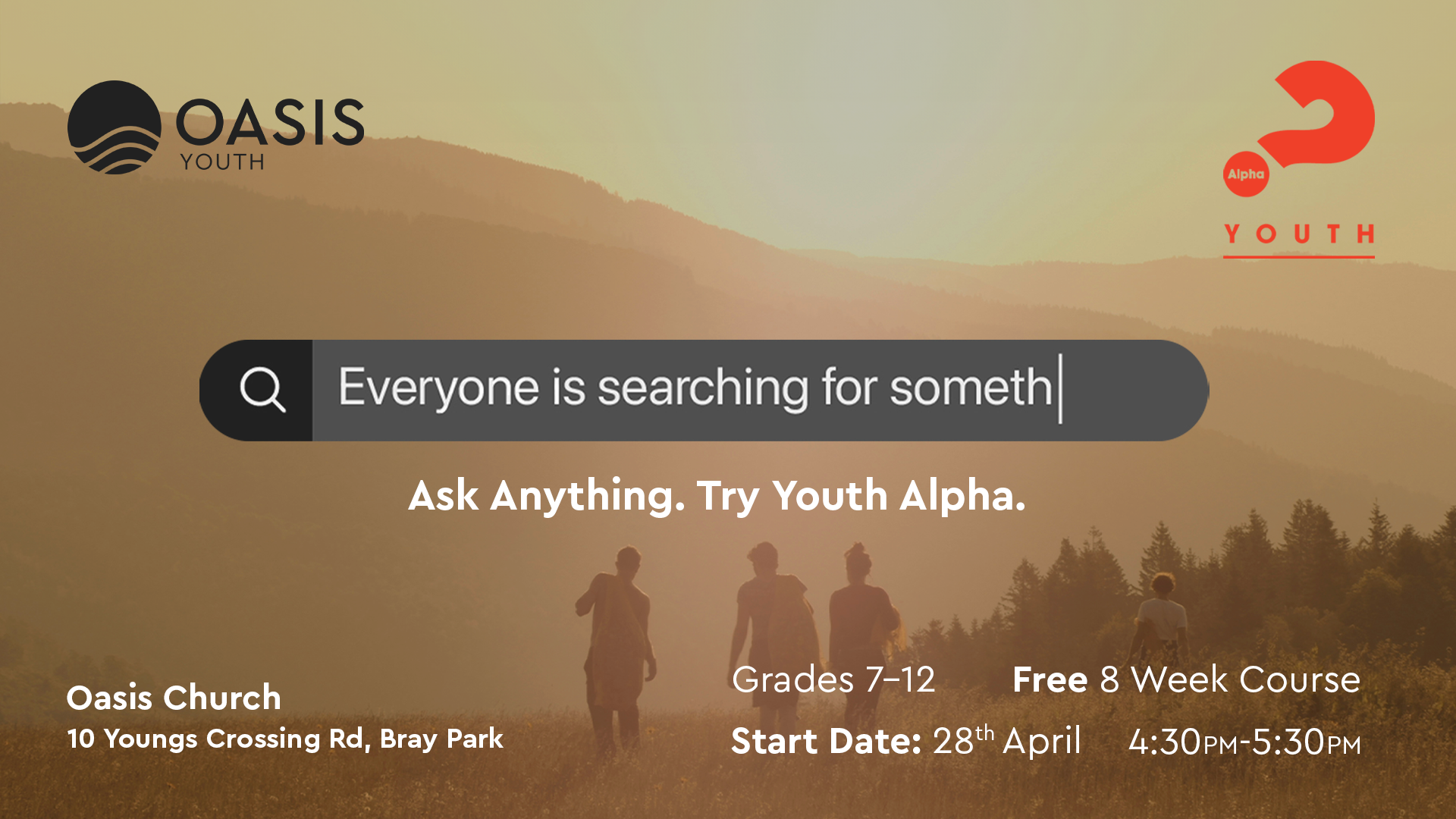 Oasis Church 10 Youngs Crossing Rd, Bray Park, QLD, AustraliaYouth Alpha will be run as an 8-week series on Sunday afternoons from 4:30pm-5:30pm starting on Sunday, 28 April. It is a great opportunity for young people to explore questions regarding the Christian faith, with